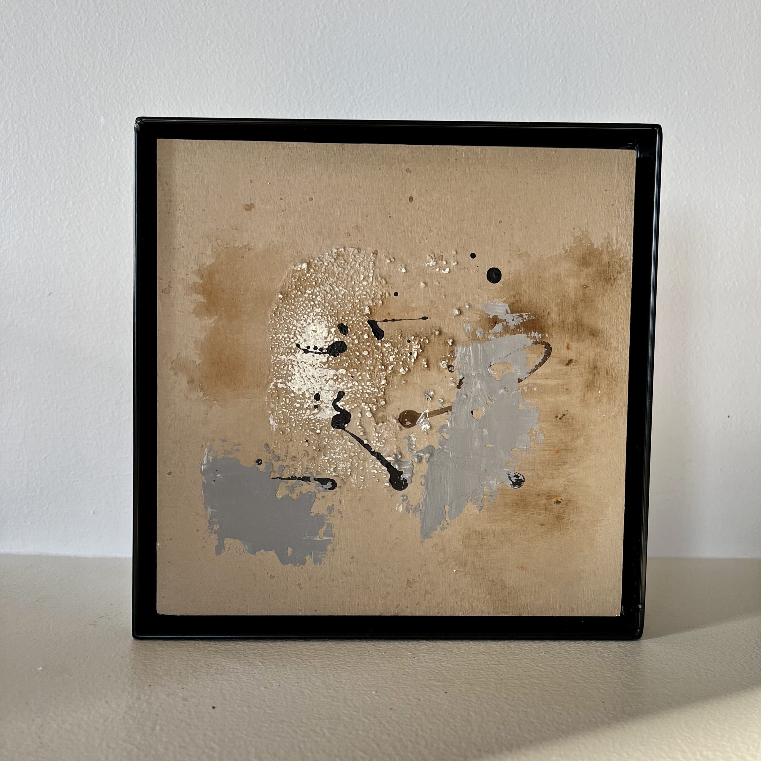 Hand-crafted abstract, with irregular patches, splatters, and textured marks evoke the feeling of aged walls or peeling paint.
