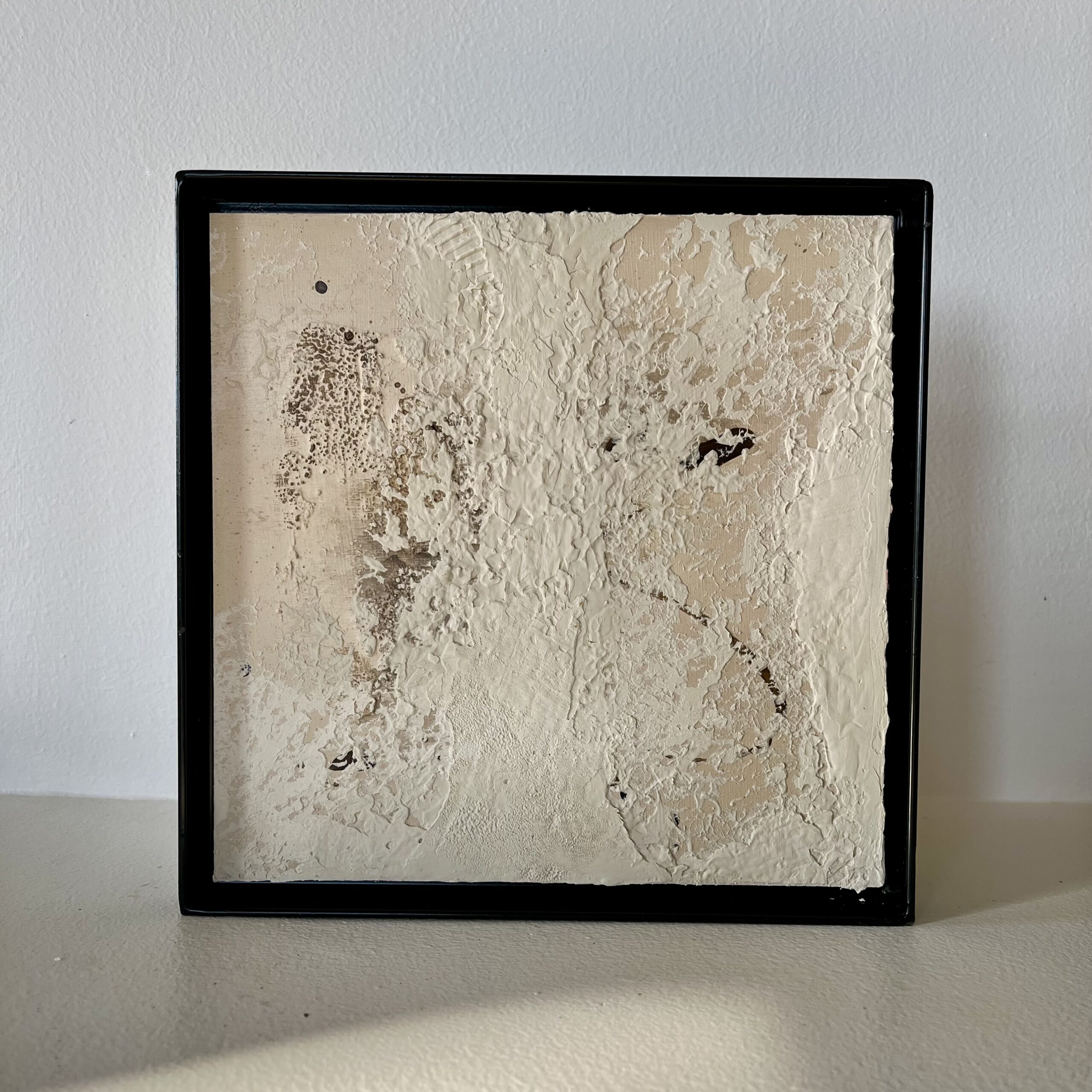 Hand-crafted abstract, with irregular patches, splatters, and textured marks evoke the feeling of aged walls or peeling paint.