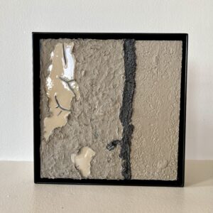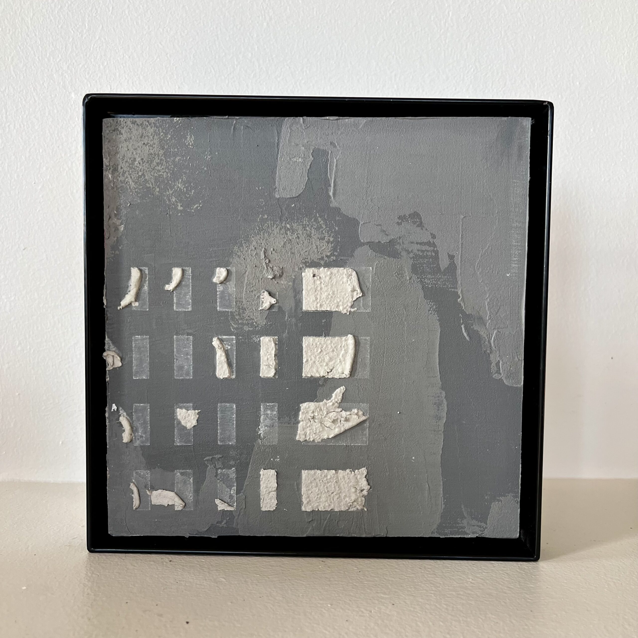 Hand-crafted minimalist abstract painting featuring a subtle textured grid against a muted gray background, blending smooth and rough surfaces within a calm, monochromatic palette.